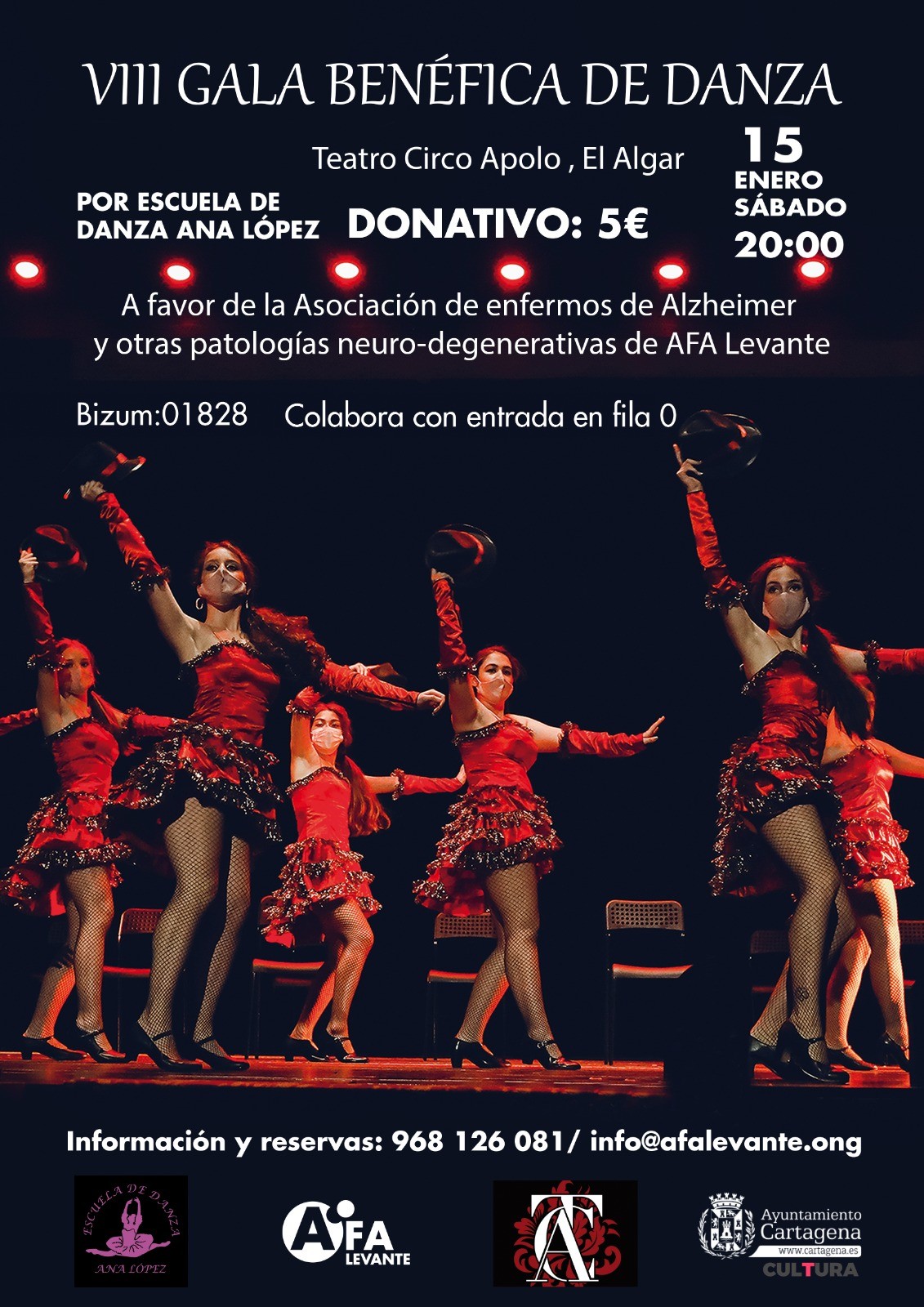 La gala benéfica de la escuela de baile de Ana López, este sábado 15 de enero, en el Teatro Circo Apolo de El Algar a beneficio de la asociación de familiares y enfermos de enfermedades neurodegenerativas y prevención de envejecimiento patológico, AFA Levante, y cuatro rutas guiadas por los museos y monumentos de Cartagena son las actividades principales del fin de semana en la ciudad portuaria.